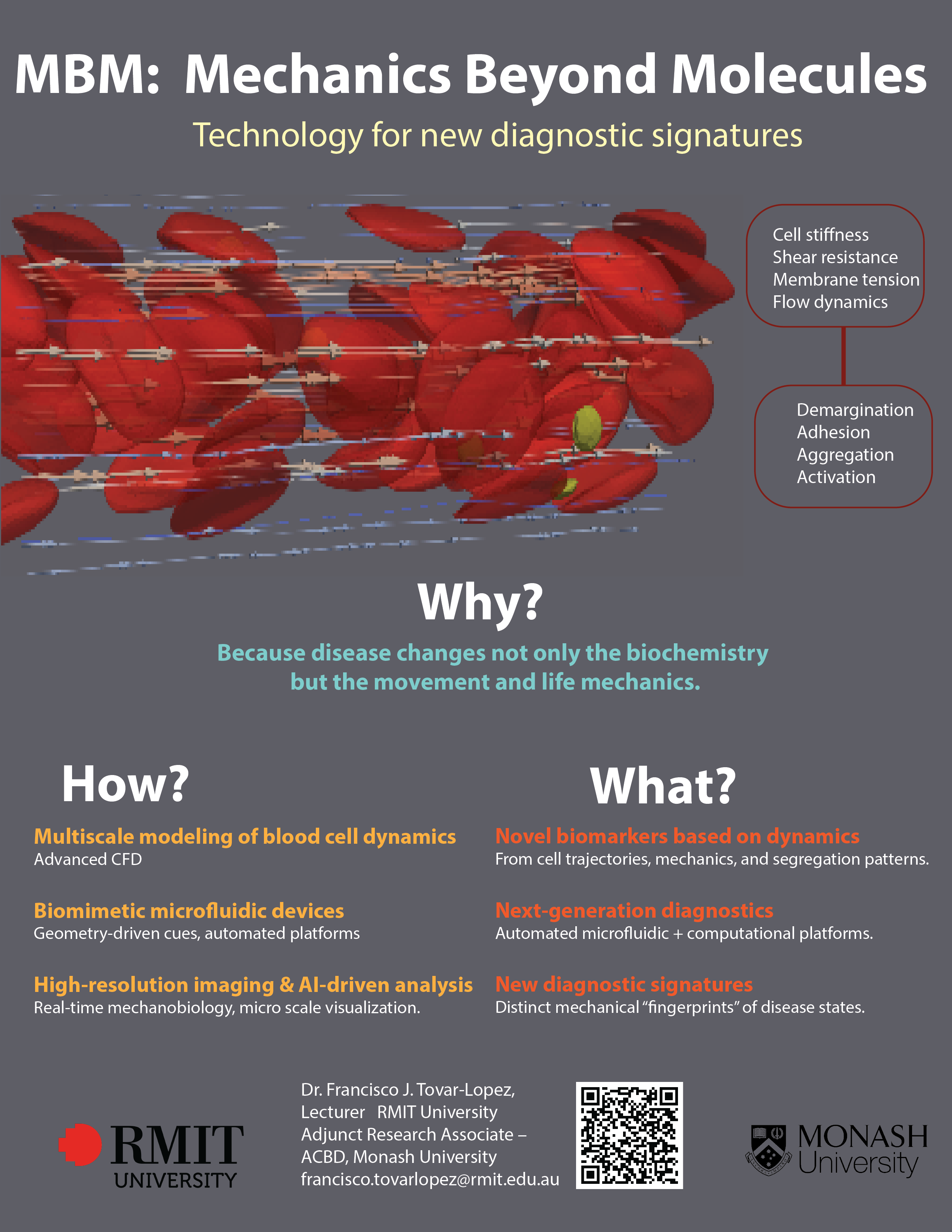 < MBM is my research program exploring how geometry, forces and multiscale flow encode a mechanical information layer in blood and soft tissues. By extracting these mechanical diagnostic signatures, we can detect physiological and pathological states that biochemical markers alone cannot reveal. I integrate microfluidics, viscoelastic flows, CFD modelling and real-time sensing to measure how cells and plasma respond to controlled mechanical fields. This work is now evolving toward identifying and standardizing mechanical signatures across platelets, red blood cells, plasma rheology and disease states.